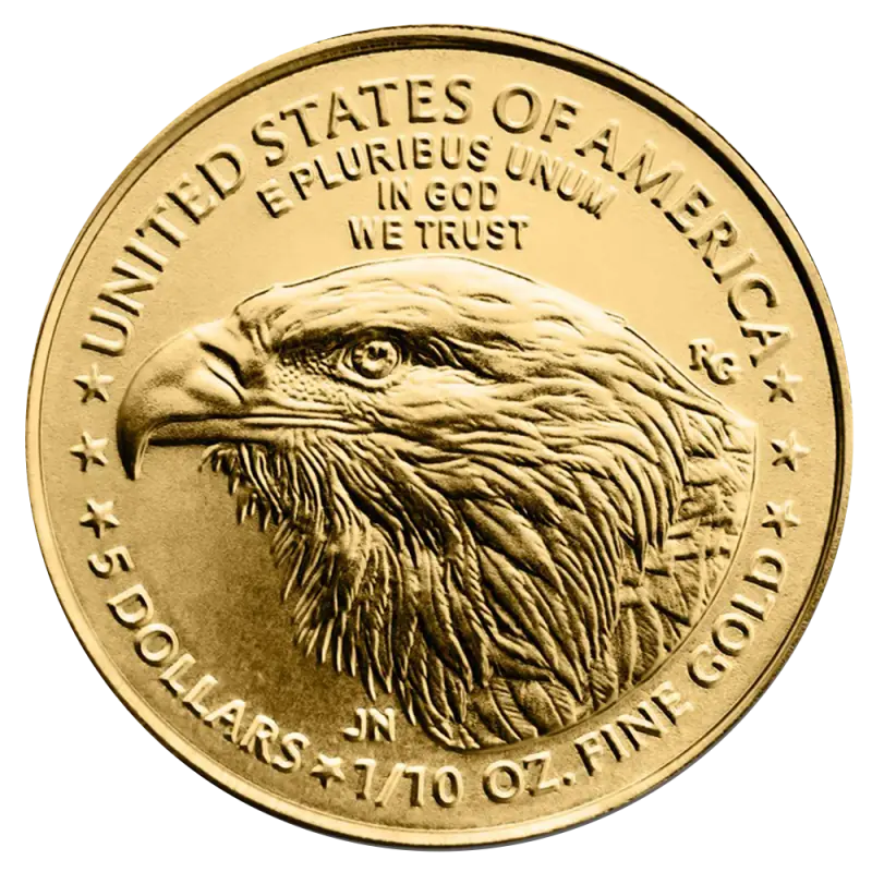 Baksiden av 2025 1/10 toz Gold Eagle Coins kommer med det nye designet fra Jennie Norris. Dette er det første hele året med tilgjengelighet som viser nettopp designet av det detaljerte hodet til en amerikansk hvithodehavørn. Dette i form av et relieff med venstre profil.