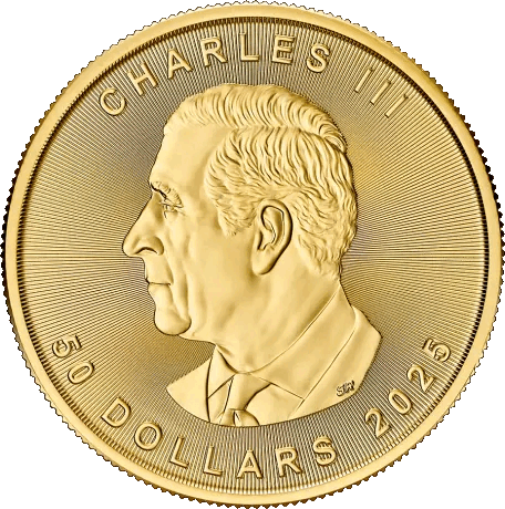 Kong Charles III pryder forsiden av 2025 utgaven av 1 toz (31,1 gram) Gold Maple Leaf mynten. Dette portrettet av Hans Majestet ble laget i 2024 for Royal Canadian Mint av Steven Rosati. Utgivelsen i 2025 markerer kun andre gangen Charles III har vært med på Canadian Maple Leaf. Denne venstrevendte avbildningen viser kongen uten krone på hodet.