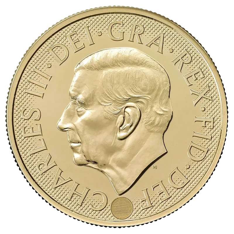 Forsiden viser portrettet av Kong Charles III, som markerer en ny epoke i britisk mynthistorie. Baksiden prydes av det legendariske motivet St. George og dragen, designet av Benedetto Pistrucci i 1817 – et av de mest kjente og respekterte motivene innen europeisk myntkunst. Dette tidløse designet gir mynten både kunstnerisk og historisk verdi.